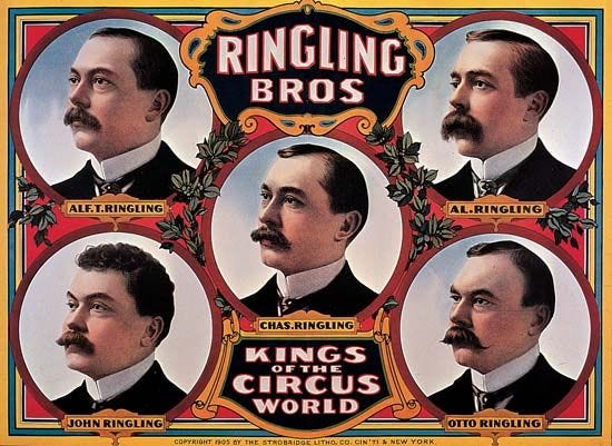 The Ringling Brothers Circus began in 1884 in Baraboo, Wisconsin. It was founded by five (of seven) of the Ringling Brothers, Albert (1852-1916), August (1854-1907), Otto (1858-1911), Alfred T. (1862-1919), Charles (1863-1926), John (1866-1936), and Henry (1869-1918).